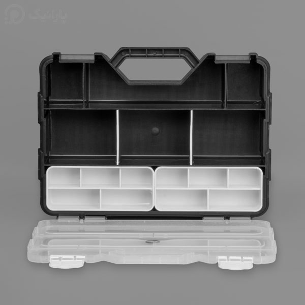 همچنین این محصول دارای دو عدد جدا کننده است که می توانید سایز خانه ها را به دلخواه تنظیم کنید. ابعاد این جعبه 6×22×29 سانتی متر و دارای وزن سبک و قابل حمل می باشد.وجود دو عدد چفت پلاستیکی بر روی درب جعبه موجب محکم شدن درب و جلوگیری از ریختن ابزار ها به بیرون می شوند.